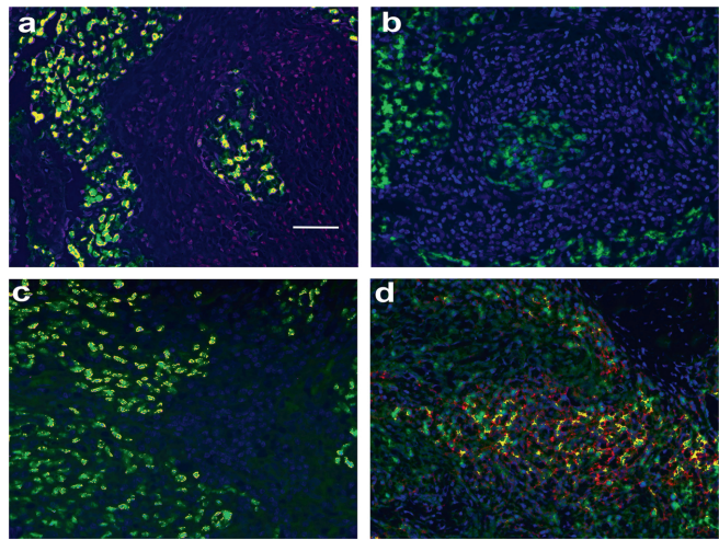 T細胞(熒光紅)普遍表達ICOS(熒光綠),形成顯著共定位(熒光黃)。